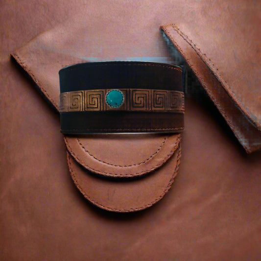 Rolled copper, leather and turquoise bracelet
