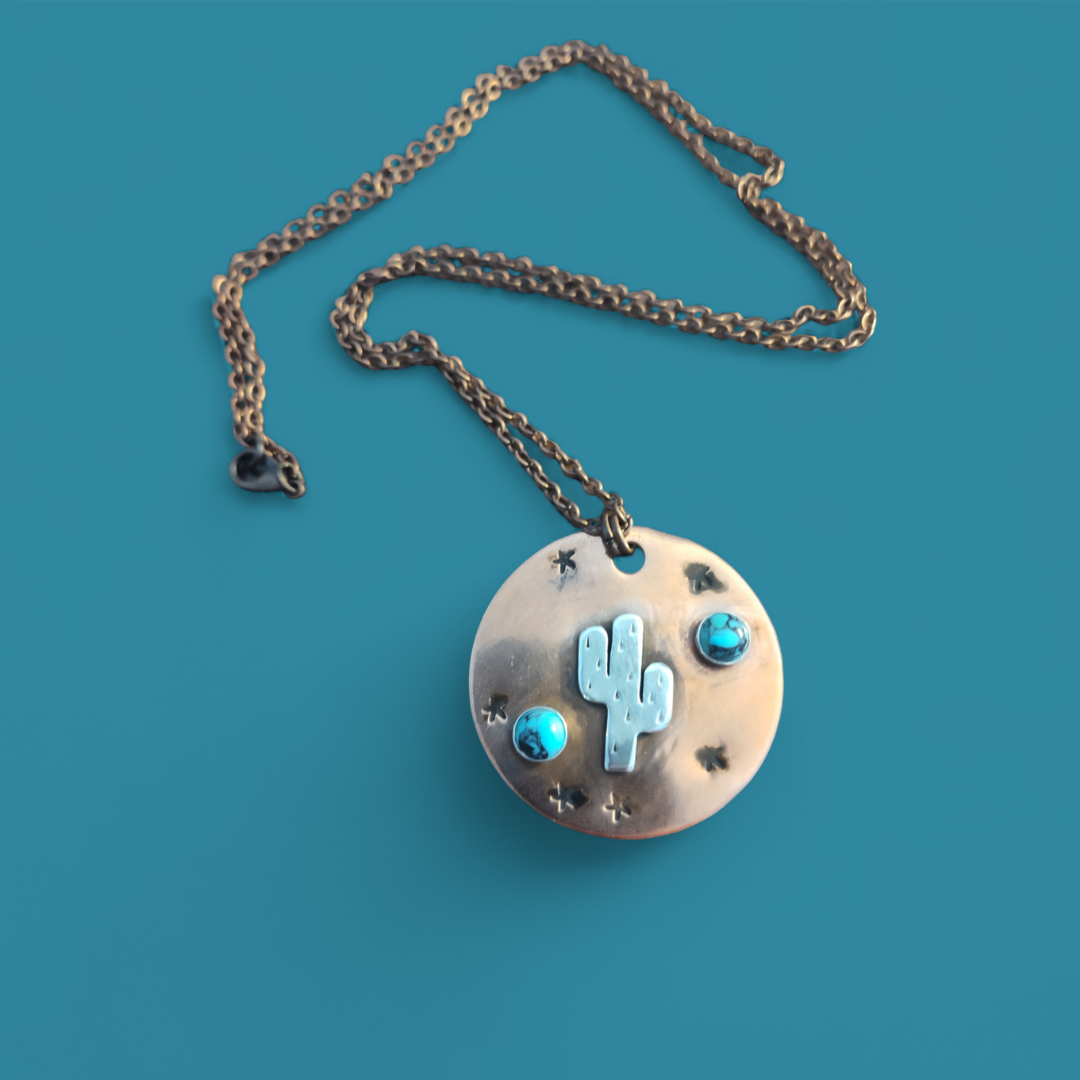 Copper hand-stamped sterling silver cactus & turquoise necklace