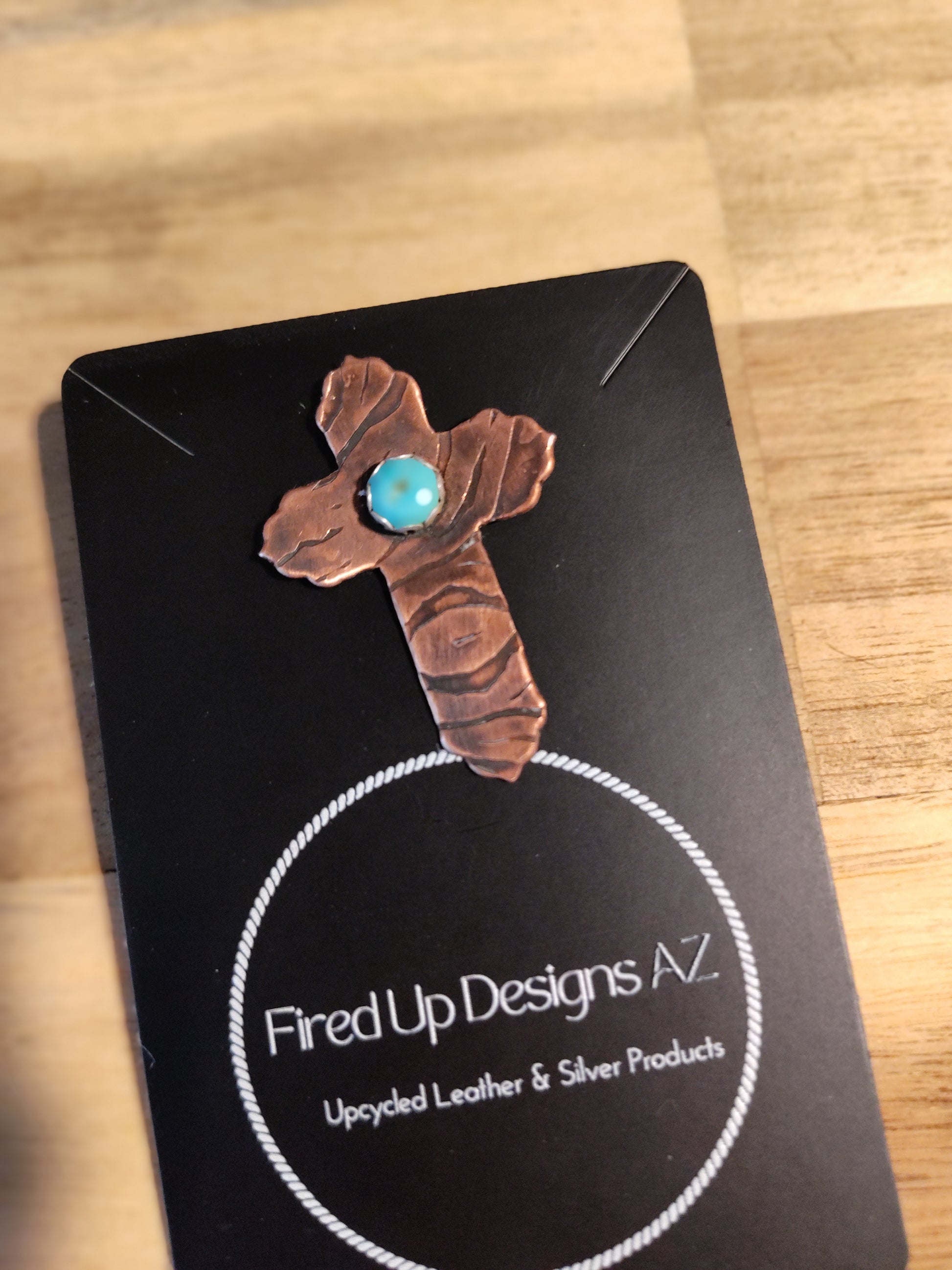 Copper Textured Cross with Turquoise Hatpin with light patina coloring.