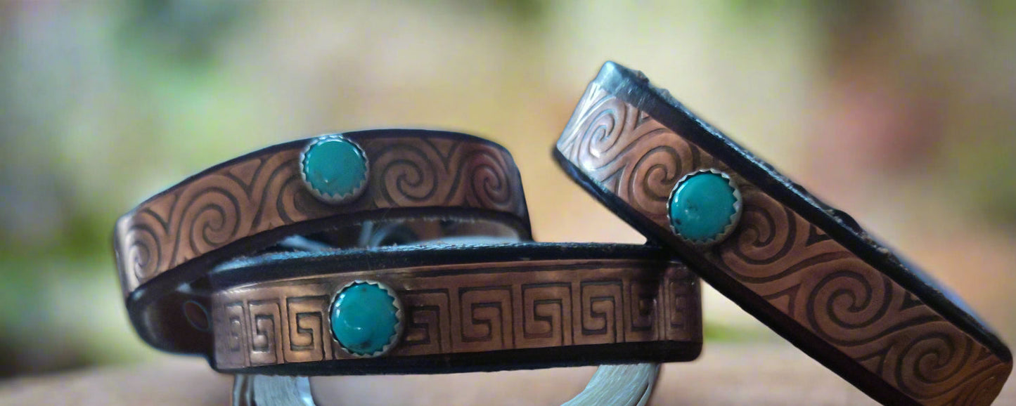 Rolled copper, leather, and turquoise bracelet with patina. Small size bracelet with snaps.