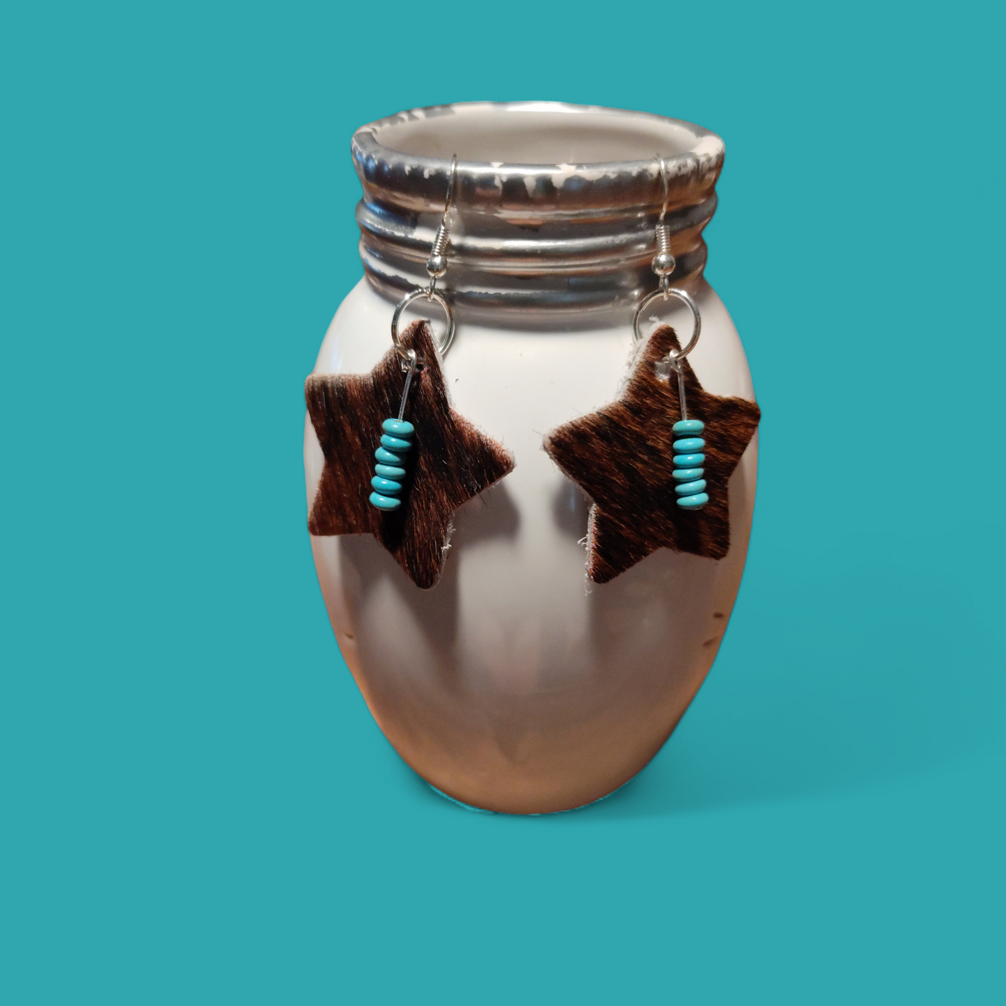 Upcycled star brown cowhide earrings with turquoise. Sterling silver.