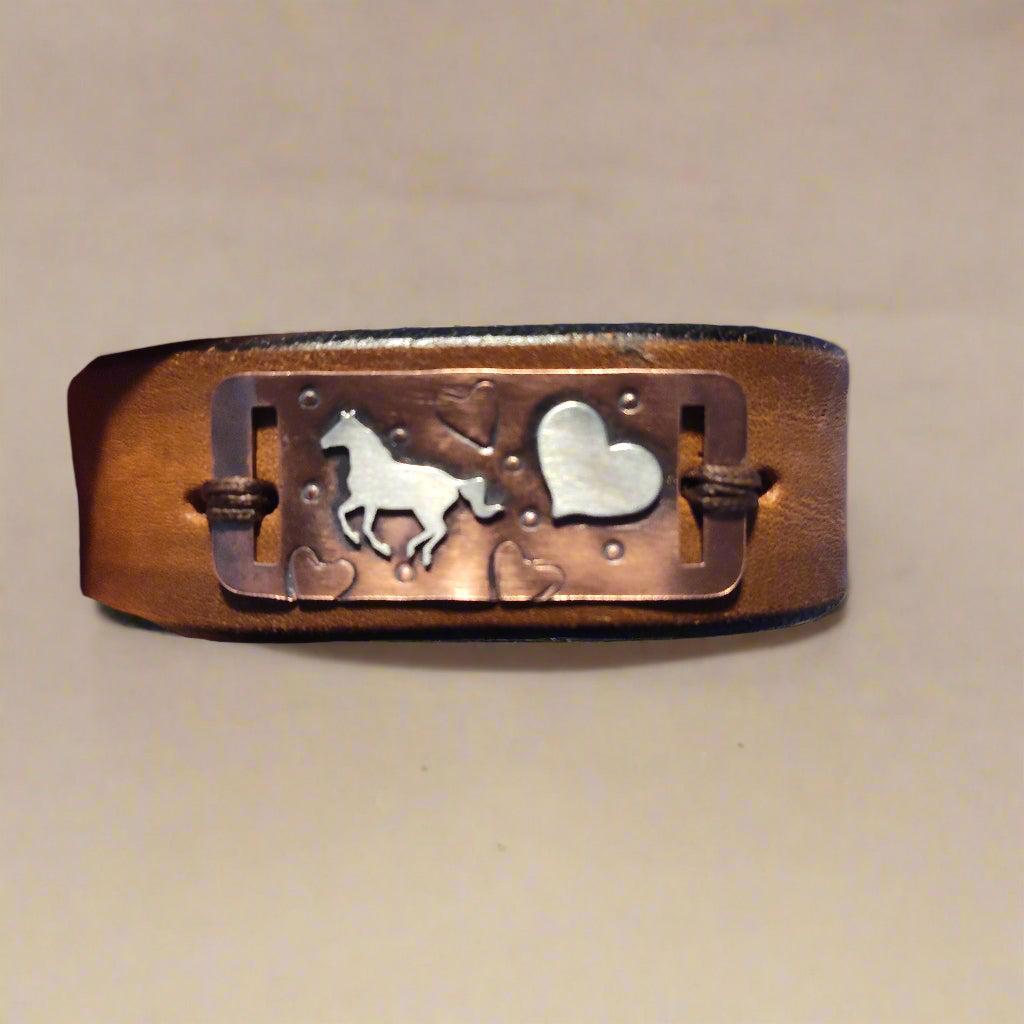 Upcycled leather sterling silver horse with heart and copper cuff bracelet